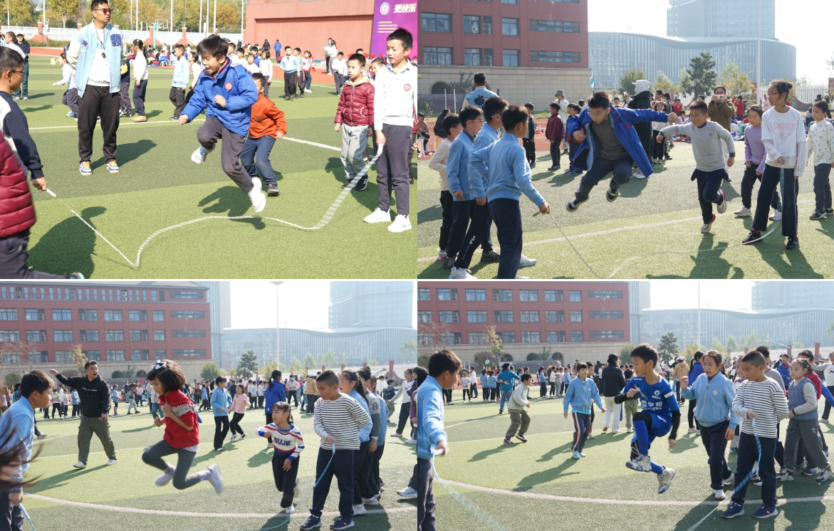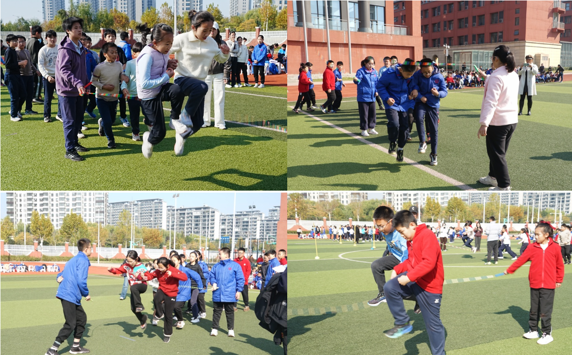 三、四年级的“火炬接力”仪式感满满,象征着拼搏精神的 “火炬”在同学们手中传递,每一次交接都凝聚着信任与期待;“8 字跳长绳”项目中,每个班级都有自己的“独门秘籍”,展现出超强的团队协作力。